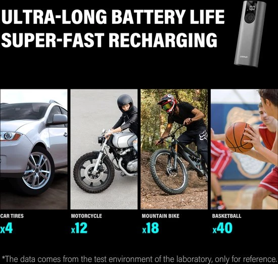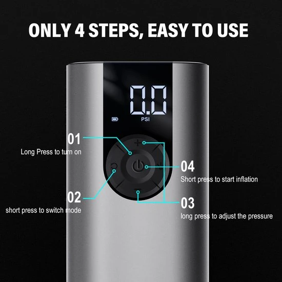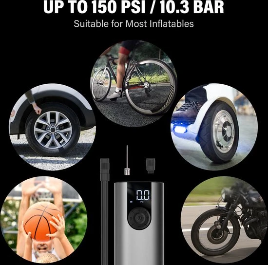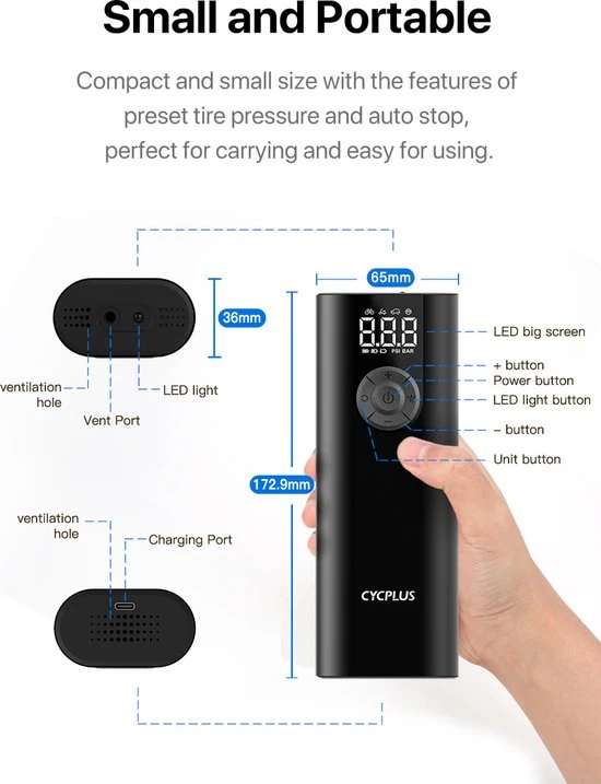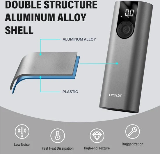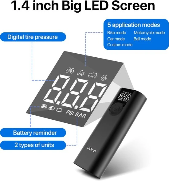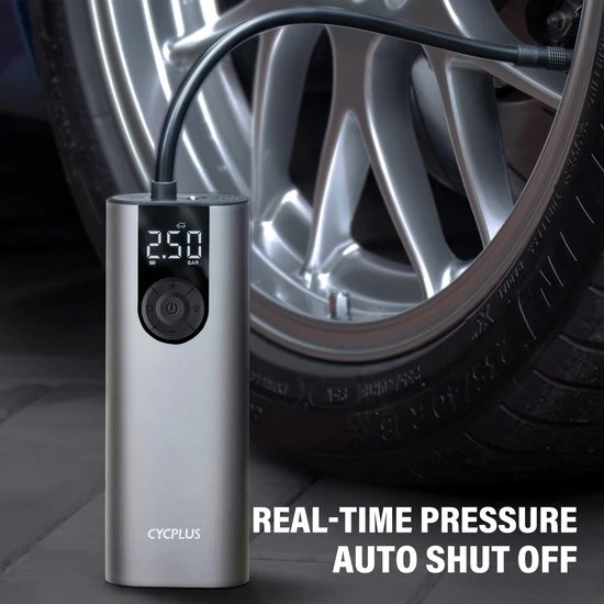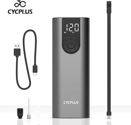 De Cycplus nieuwste mini compressor accupomp. De zeer stille, stevige, slimme en handige compacte draagbare elektrische batterijpomp. Hoeft niet meer aangesloten te worden op een stroomnet! Altijd een eigen compressor bij de hand, zeer licht en gemakkelijk mee te nemen. Geschikt voor alle soorten banden. Ook te gebruiken om auto’s, fietsen, brommers, motoren, scooters, voetballen of ballonnen mee op te pompen. Deze pomp is perfect voor wie van gemak houdt. Deze compressor geeft de live druk aan en is standaard voorgeprogrammeerd voor fietsen, auto’s, motoren en ballen. Verkrijgbaar in het zilver, zwart en blauw. CYCPLUS A8 is de sterkste batterijcompressorpomp. Met een sterkere batterij, een accurate live druk meting en een sterke LED-lamp. Hierdoor is hij superieur boven andere elektrische pompen. Hij is multifunctioneel, uitgerust met een 5200 mAh batterij, de krachtigste batterij in de serie en in 2 uur volledig opgeladen. Ook zorgt hij voor een goede overbelastingsbeveiliging door middel van 2 ventilatoren. Daarnaast draagt ook de extra beschermde luchtslang hieraan bij.