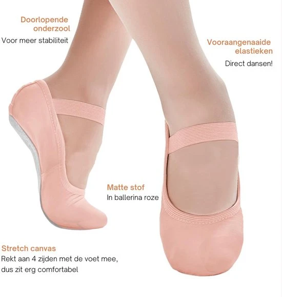 Deze balletschoenen zijn heel gemakkelijk en snel aan te trekken, want het wreefelastiek is al aan de schoen bevestigd. Door het unieke rekbare materiaal is de pasvorm ook heel mooi en sluit de balletschoen mooi aan op de voet, zonder te knellen. Er is geen aantrekkoordje bevestigd op de schoen (dat zie je vaak bij andere modellen wel), hierdoor hoef je dus niet bang te zijn dat de strikjes per ongeluk tijdens de dansles los raken.