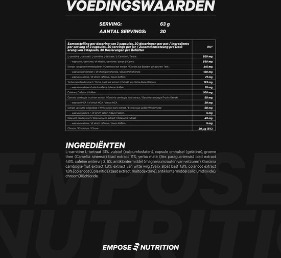 De Empose Nutrition Thermo Fatburner is samengesteld met alleen de meest hoogwaardige ingrediënten. De Empose Thermo Fatburner bevat de krachtigste samenstelling in ons assortiment. Op deze manier is het een uitstekende toevoeging op jouw dieet. Met de Empose Thermo Fatburner weet je zeker dat jouw lichaam alleen de beste ingrediënten van een fatburner binnenkrijgt zoals, cafeïne, L-carnitine-L-tartraat en groene theeblad extracten.
