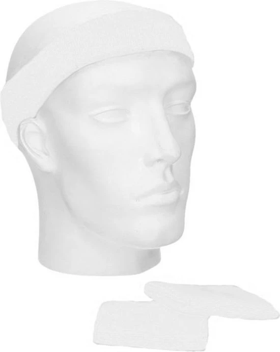 Zweetbandjes set in de kleur wit. Dit setje bestaat uit twee polsbandjes en een hoofdband. De polsbandjes zijn 8 cm breed. De hoofdbandjes zijn ongeveer 6 cm hoog en hebben een omvang van ca. 58 cm. Materiaal: 80% katoen en 20% elastaan. Gekleurde zweetbandjes voor een sportdag of evenement. bestaande uit 2x Zweetbandjes gekleurd voor de pols, 1x Hoofd zweetbandjes in alle kleuren