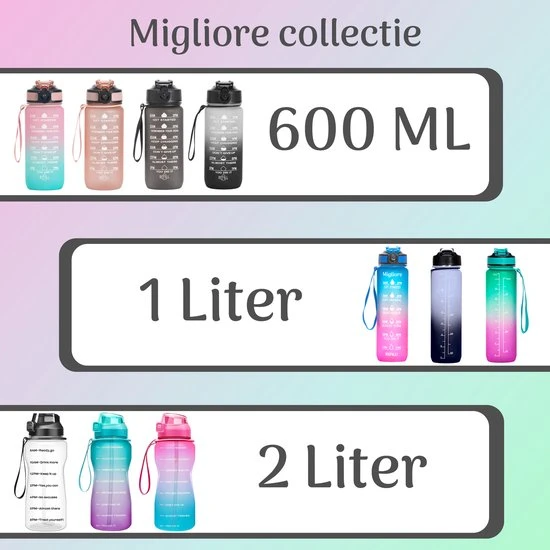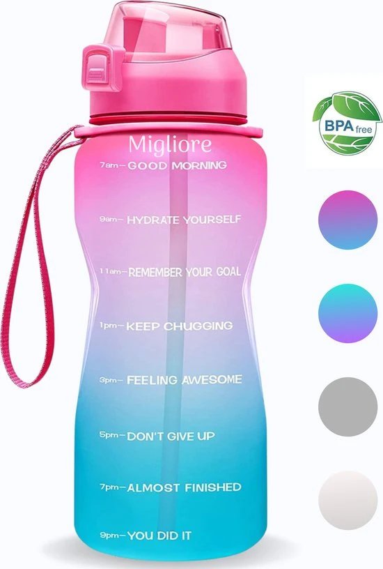 Deze Bidon van Migliore is ideaal om genoeg vocht binnen te krijgen. Door het handige rietje en de mooie kleuren zult u de fles overal mee naartoe willen nemen. De Bidon beschikt over een draagriem waardoor hij gemakkelijk mee te nemen is, ook zit er een handig slot op waardoor de fles niet kan gaan lekken. Kies ook voor de Bidon van Migliore en drink door de tijd markeringen en aanmoedigingsteksten elke dag genoeg water.