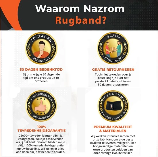 Wij zijn pas tevreden als jij dat bent. Daarom bieden we je altijd 100% tevredenheidsgarantie op je NAZROM Rugband. Ben je toch niet helemaal tevreden over je bestelling? Je kunt het product kosteloos binnen 30 dagen retourneren.