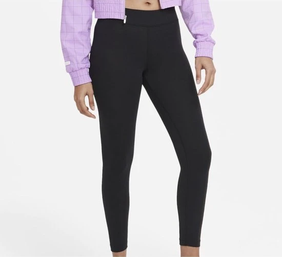 The Nike Essentails Leggings have a high waist with a comfortable, elastic waistband. The soft cotton blend wicks away sweat and provides a comfortable feel. A white Nike logo is visible on the lower leg. The sports leggings have a 7/8th length and therefore fall just above the ankle.