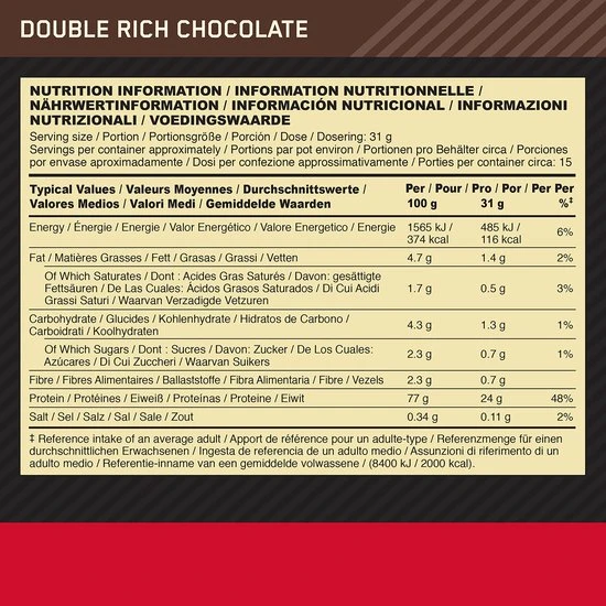 De proteïneblend van Optimum Nutrition bestaat voornamelijk uit whey isolaat, waardoor iedere shake maar liefst 24 gram hoogwaardige eiwitten, 3.5 gram glutamine, 5 gram BCAA’s en slechts 3 gram koolhydraten bevat. Dit maakt Gold Standard Whey de perfecte shake voor spierherstel na een training.