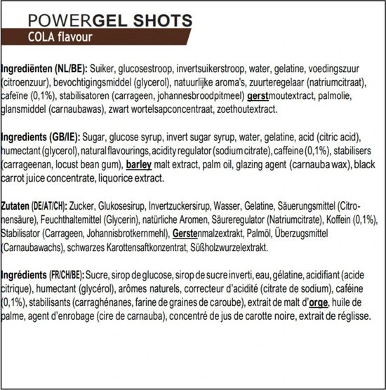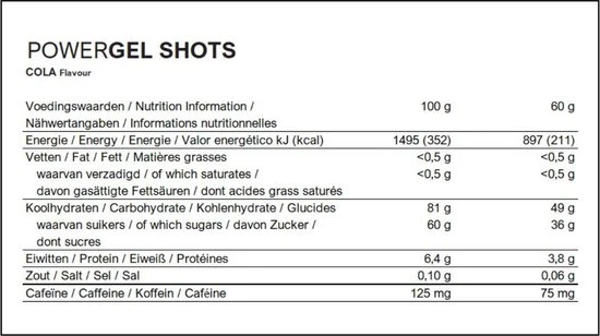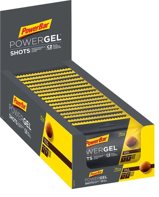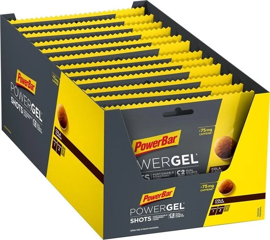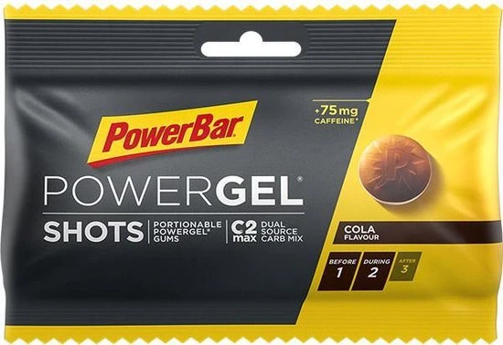 Power Gel Shots zijn een alternatief voor onze Powerbar Powergels. PowerGel Shots hebben een vloeibare vulling met de C2MAX koolhydratenmix van binnen voor snelle energie en een zachte gum van buiten. Powergel Shots zijn zeer handig om mee te nemen tijdens lopen, fietsen, roeien, moutainbiken, triatlon etc. Een zakje Powergel Shots bevat 9 stukjes. Ter vergelijking: 5 stukjes staat gelijk aan 1 Powergel. Een doos Powergel Shots bevat 24 zakjes.