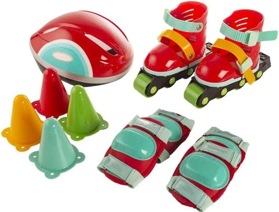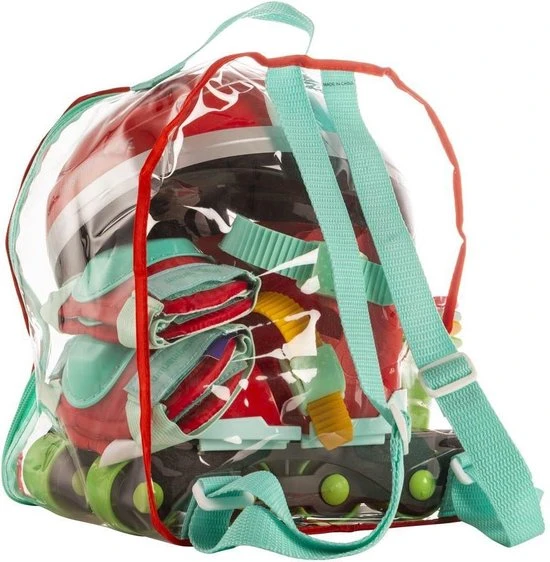 Rugzak met complete skateset. Inline skates (4 standen, afhankelijk van de voetmaat), helm, elleboogbeschermers, kniebeschermers en 4 kegels. Geschikt voor de maten: 24 t/m 29.