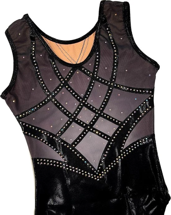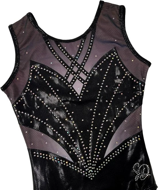 Dit lekker zittende mouwloze turnpakje is gemaakt mystic glitter stof stof met gaas ombre in de kleuren zwart en grijs. De steentjes zijn in de kleur zilver AB (meerdere kleuren). Door de korte mouwen ideaal om mee te trainen, maar ook perfect te dragen als wedstrijdpakje door de mooie details.