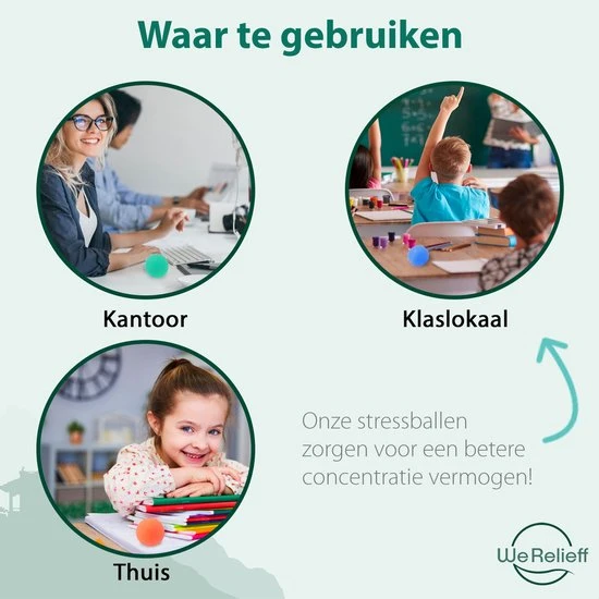 Betere concentratie, meer ontspanning of je onderarm versterken? De WeRelieff® stressballen nemen stress en spanning razendsnel weg. Deze slimme handknijpers stimuleren de spieren en mentale rust voor een sterkere grip & optimale focus.