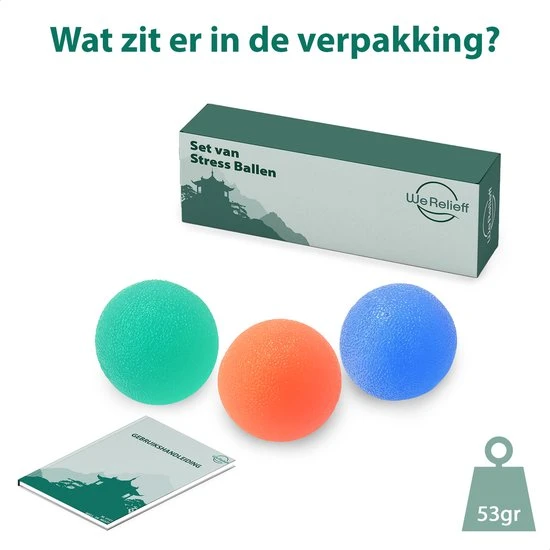 Onze stressballen worden geleverd in een set van drie zodat je zelf een geschikte weerstand kunt kiezen. Met een kracht van 20, 30 en 35 kg zit er voor iedereen een juiste stressbal tussen. Door simpelweg te knijpen wordt stress weggenomen, kun je je beter concentreren en voelt het hoofd rustiger.